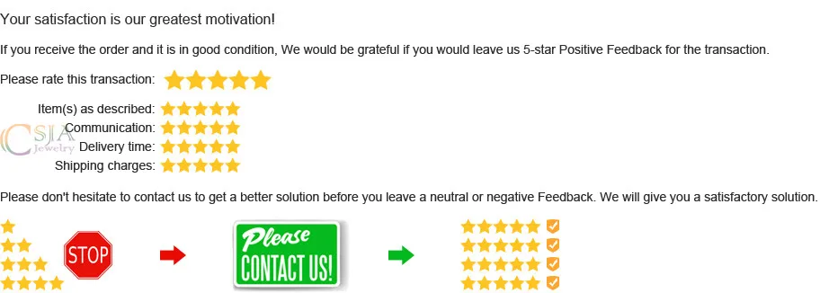 Dear Buyers, Your satisfaction and positive feedback is very important . Please leave positive feedback and 5 stars if you are satisfied with our products and service. If you find any problems about our products after receive them, Please immediately contact us and show us some pictures of the problems, We will make our best efforts to solve them for you.